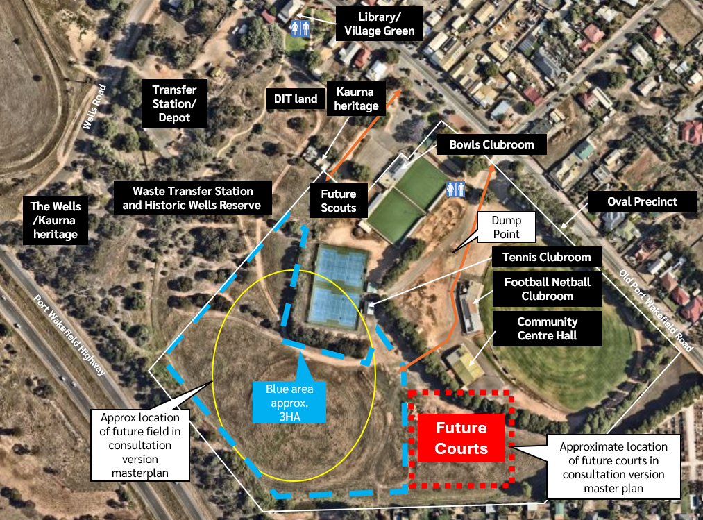 Initial discussions with representatives of Cricket and Australian Rules Football confirms there is a need at some time in the future for a second sports field in the western part of the Oval precinct. Likewise, increased courts will also be needed. This need exists due to the progressive, year by year population growth in Adelaide Plains and wider northern Adelaide.